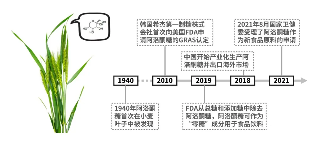 阿洛酮糖自1940年首次在小麦叶子中被发现以来,科学家就其功能、应用以及合成途径展开了研究,直到2011年韩国希杰第一制糖株式会社首次向美国FDA申请D-阿洛酮糖的GRAS认定,得到“没有问题”的回复后,D-阿洛酮糖才在美国作为膳食添加剂和部分食品配料被允许使用,随后阿洛酮糖获得了包括日本、韩国、加拿大、澳大利亚及新西兰在内的13个国家的法规许可,阿洛酮糖的产业化进程正式开启。